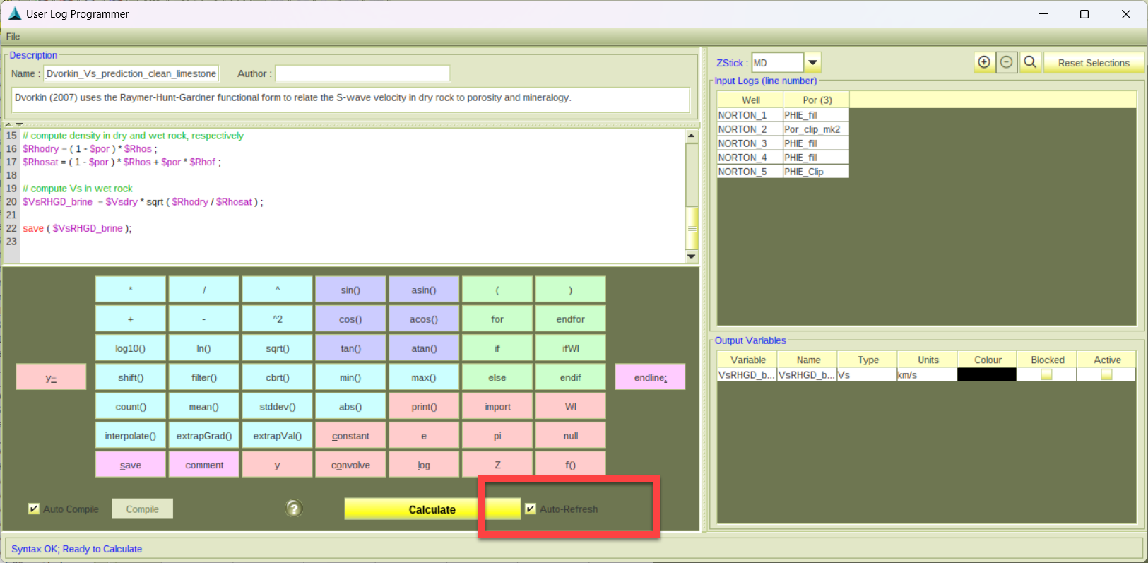 Calculated logs are central to most rock physics and petrophysical workflows, but keeping them updated as raw input data evolves can be a persistent challenge. RokDoc 2026.1 introduces automatic refresh for outputs from the log programmer: whenever an input log is adjusted, corresponding calculations update instantly, accompanied by clear visual cues.