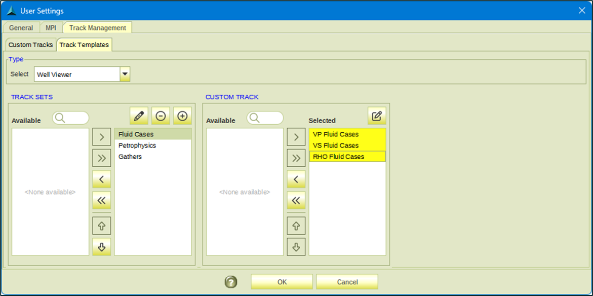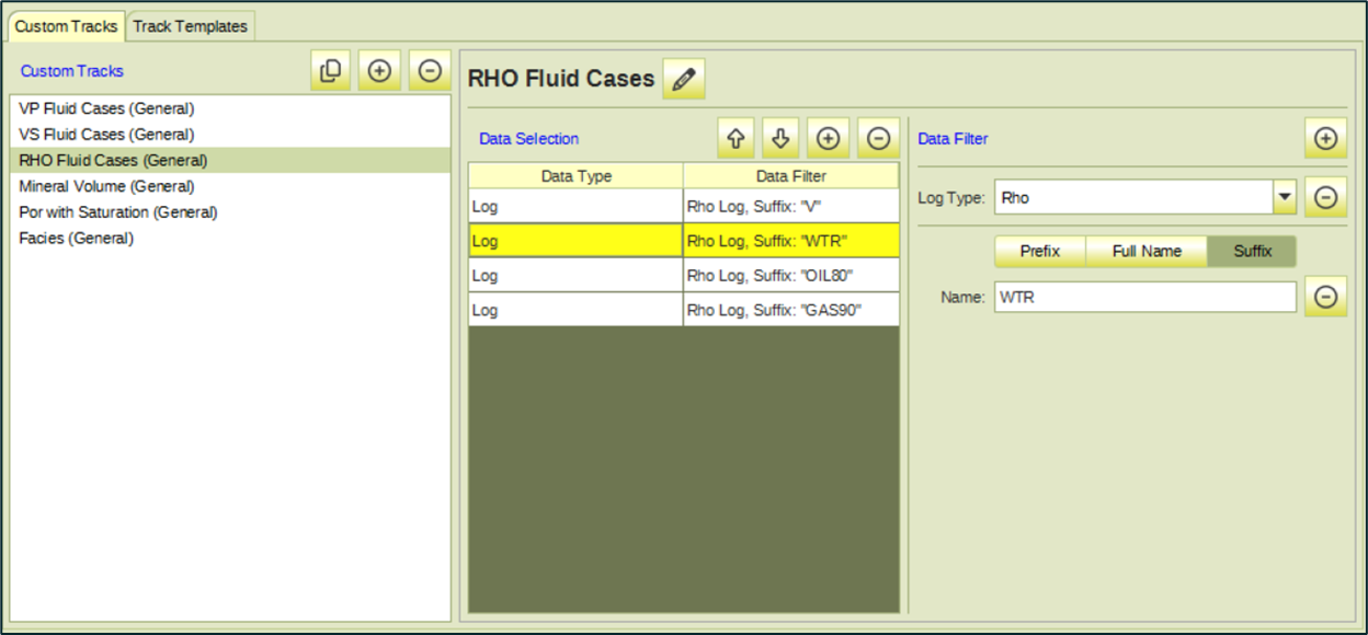 With pre-configured collections of log tracks, where each track can be defined by log type, active status, or specific filter strings, users can pre-populate a template with key logs (for example, VP, VS, Rho, and various gathers for fluid substitution results) and configure how they are displayed and organized.