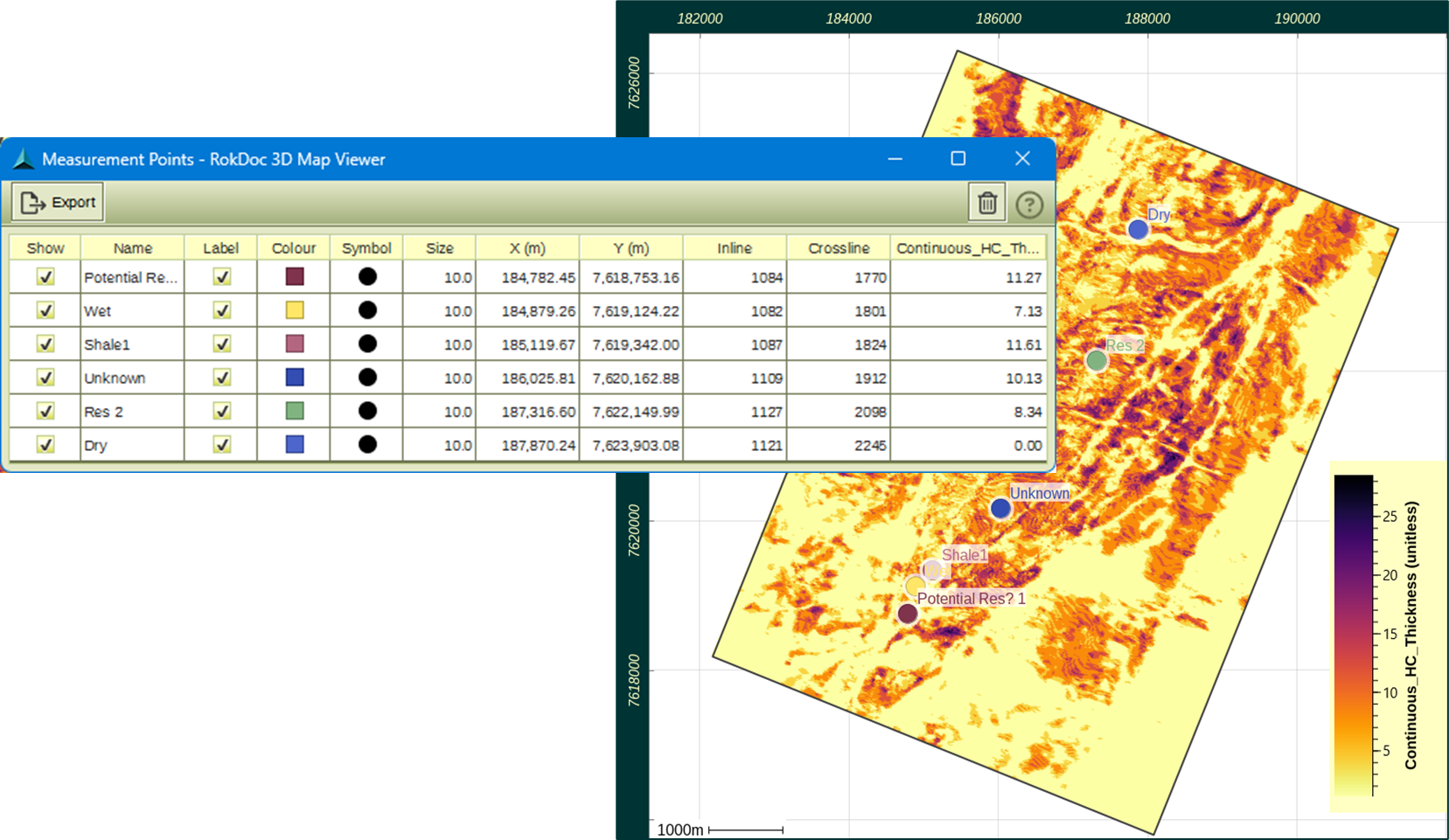 Interpretation in modern geoscience hinges on rapid access to the right data for every spatial and stratigraphic question. In RokDoc 2026.1, the map viewer introduces a new measurement point value display, instantly showing horizon and map attribute values at each X, Y point and slice along Z. This feature is especially valuable in structural and attribute mapping, where cross-checking surfaces and property distributions must keep pace with interpretation decisions. In addition to the map features, users can now export measurement point tables as ASCII files, complete with facies and lithology names where applicable.